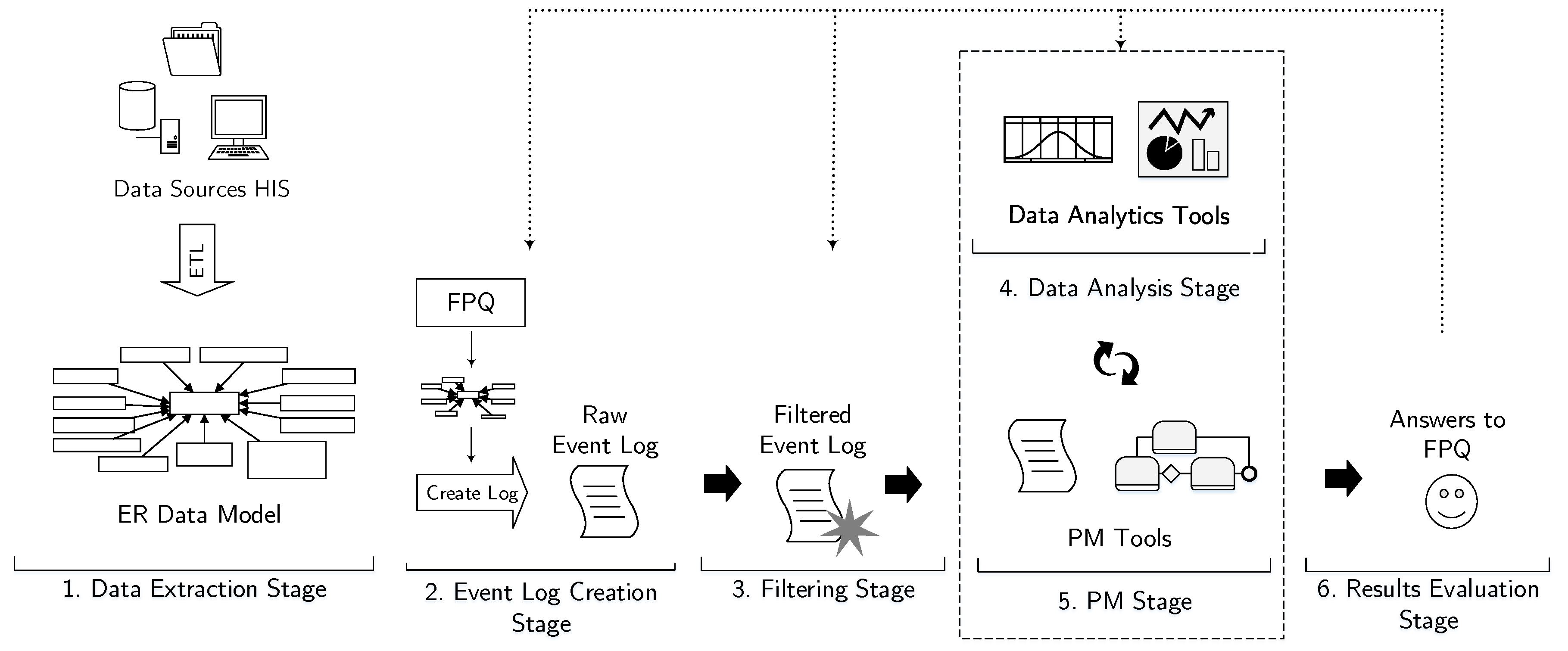 The methodology consists of six stages (as shown in Figure 3), as follows: (1) extracting data from HIS; (2) creating an event log (main input for process mining techniques) based on the FPQ; (3) filtering the log for any given clinical context; (4) applying data analysis; (5) applying process mining (PM) techniques; and (6) analyzing the results with the experts. Each of the stages is explained below: