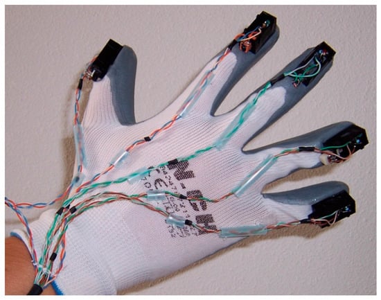 According to previous studies [,], sensitivity towards the location of a touch or toward the separation between touched locations is greater when the body site is more mobile. Finger stimulation in this case fulfils this principle, and this was the main reason for choosing the glove as the efferent HMI. Thus, the fingers are used to stimulate the subject. On the other hand, it has been shown that repeated stimulation of a specific part of the body can lead to an improvement of tactile discrimination performance for that part of the body []. This allows the device to meet the user’s wishes regarding the location of the HMI in another target body part. Hence, other possible HMI locations can be proposed, though proper training is required.