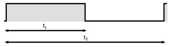The explained rotation frequency is modulated by means of an on-off keying signal in order to achieve two keying frequencies, i.e., 1 Hz or 10 Hz, as shown in Figure 3. Thus, two possible stimuli are implemented: 170 Hz modulated with 1 Hz or 170 Hz modulated with 10 Hz. Two performance parameters should be taken into account: the time between the onset and the end of a burst, t1, and the time between the onsets of two bursts, t2 (Figure 4). As the burst duty cycle is 50%, then t2 is two times t1. The 1 Hz and 10 Hz frequencies, in combination with the 50% duty cycle, meet the t1 and t2 timing constraints to achieve an optimum performance [].