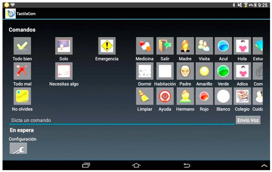 At the other end of the communication channel, the afferent interface is based on a general purpose mobile phone or tablet. Contemporary mobile phones are like small computers, which allows for a broad set of applications. Therefore, an application that provides the user with a set of pieces of information, i.e., concepts or ideas, was developed, as shown in Figure 5. This set contains the pieces of information that somebody might want to convey to a deaf-blind subject. The unimpaired user can select these messages or ideas from an icon menu, by typing them or by voice recognition. Thus, the previous afferent interface based on a personal computer [] is substituted by a more portable one.