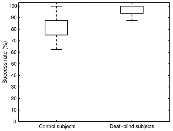Compared to the CS, the DBS had a better performance. This was not totally unexpected as gathered in the corresponding scientific literature: people with some kind of sense impairment often achieve better acuity through another sense (for example, touch) [,]. Therefore, future studies on vibrotactile recognition can be carried out by focusing on the performance and the learning of unimpaired subjects. This is due to the fact that most DBS develop better touch sensitivity than unimpaired people; notwithstanding, it is convenient to ensure the validity of the vibrotactile analyses with unimpaired individuals. This will allow us to increase the population sample, make face-to-face tests, and minimize communication issues. However, the tests also need to be performed on DBS because we cannot disregard their feedback, as they are the potential users. They should also participate in the system development sequence [].