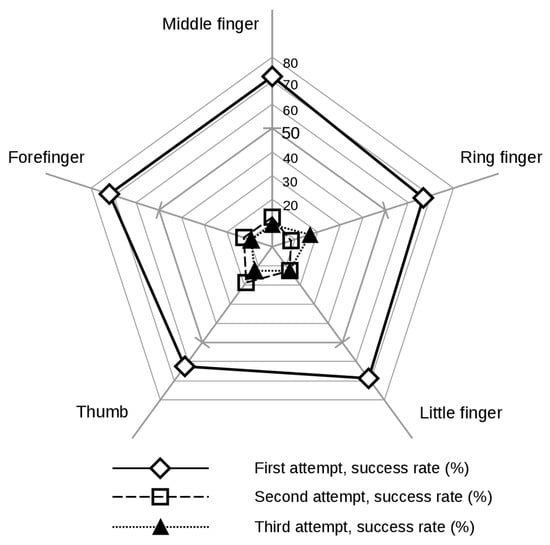 Finger success rate for each of the three recognition attempts carried out by the DBS. In the polar diagram, the similarity in performance for each of the fingers is noticeable.