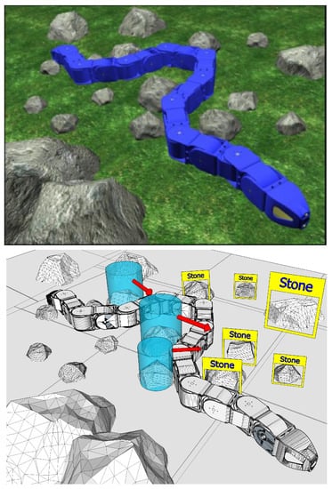 Building a robotic snake with such agility is one of the most attractive steps to fully mimic the movement of biological snakes. The development of such a robot is motivated by the fact that different applications may be realised for use in challenging real-life operations, in earthquake-hit areas, pipe inspection for the oil and gas industry, fire-fighting operations, and search-and-rescue. Snake robot locomotion in a cluttered environment where the snake robot utilises walls or external objects other than the flat ground as means of propulsion can be defined as obstacle-aided locomotion [,]. To achieve such a challenging control scheme, a mathematical model that includes the interaction between the snake robot and the surrounding operational environment is beneficial. This model can take into account the external objects that the snake robot uses in the environment as push-points to propel itself forwards. From this perspective, the environment perception, mapping, and representation is of fundamental importance for the model. To highlight this concept even further, we adopt the term perception-driven obstacle-aided locomotion as locomotion where the snake robot utilises a sensory-perceptual system to exploit the surrounding operational space and identifies walls, obstacles, or other external objects for means of propulsion []. Consequently, we can provide a more comprehensive characterization of the whole scientific problem considered in this work. The underlying idea is shown in Figure 1. The snake robot exploits the environment for locomotion by using augmented information: obstacles are recognised, potential push-points are chosen (shown as cylinders), while achievable normal contact forces are illustrated by arrows.
