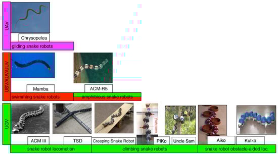 With an additional increase in terms of both EC and MC, flying or gliding snake robots may be designed as unmanned aerial vehicle (UAV) systems. These systems can be inspired by the study and analysis of the gliding capabilities in flying snakes, such as the Chrysopelea, more commonly known as the flying snake or gliding snake []. This category of snake robot still does not exist, but perhaps one day it will be realised when the necessary technological advances become a reality. However, other designs may be more practical for flying.