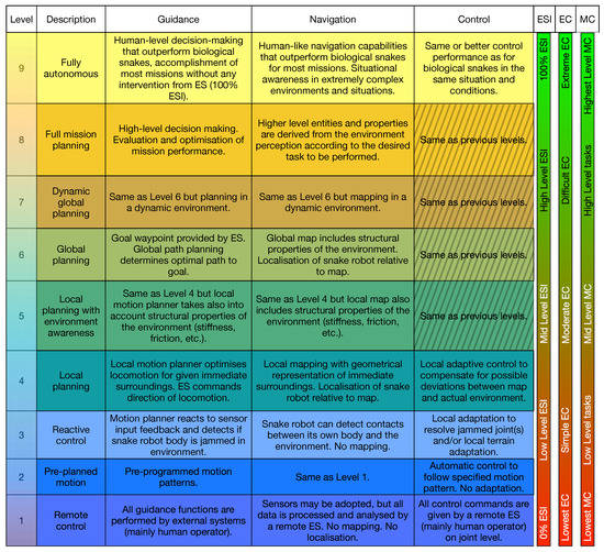 When considering snake robot perception-driven obstacle-aided locomotion, identifying and differentiating between consecutive autonomy levels is very challenging from a design point of view. Nevertheless, it is crucial to clearly distinguish autonomy levels during the design process in order to provide the research community with a useful evaluation and comparison tool. Inspired by similarly demanding systems [], a nine-level scale is proposed based on gradual increase (autonomy as a gradual property) of guidance, navigation, and control (GNC) functions and capabilities. Referring to Figure 4, the key GNC functions that enable each autonomy level are verbally described along with their correspondences with mission complexity (MC), environmental complexity (EC), and external system independence (ESI) metrics (illustrated with a colour gradient). It should be noted that the motion planner is assumed to take the environment representation as input (i.e., a map of the environment built as a fusion between different sensor data and previous stored knowledge). Then, the control function is supposed to compensate with adjustments for any possible deviations between map and actual environment.