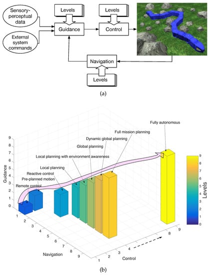 In this section, we survey snake robots as unmanned vehicle systems to highlight challenges and possibilities in the context of autonomy levels for unmanned systems. Moreover, we focus on the ability of snake robots to perform a large variety of tasks in different operational environments. When designing such systems, different levels of autonomy can be identified from an operational point of view. Based on this idea, the so-called framework of autonomy levels for unmanned systems (ALFUS) [] is successively adopted and applied to provide a more in-depth overview for the design of snake robot perception-driven obstacle-aided locomotion. Following this, the autonomy and technology readiness assessment (ATRA) framework [,] is adopted and presented to better understand the design of these systems.