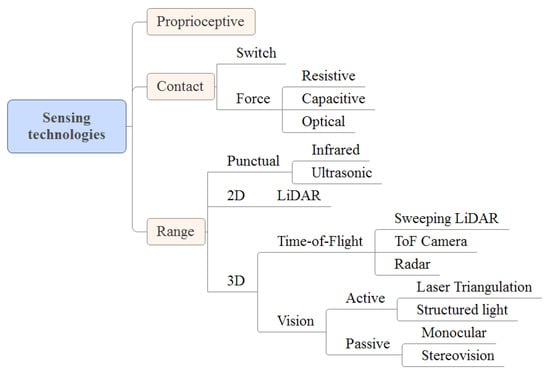 The classification of sensors in Table 2 considers both the measuring principles and sensing devices involved. For more clarity, Figure 6 summarises the sensor technologies that have been taken into account as the most representative ones found in literature regarding environment perception for navigation.