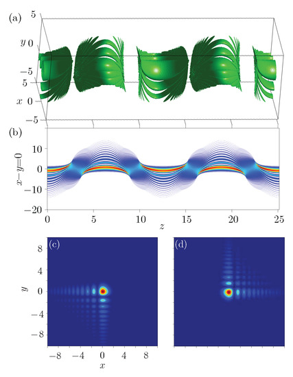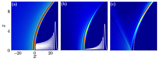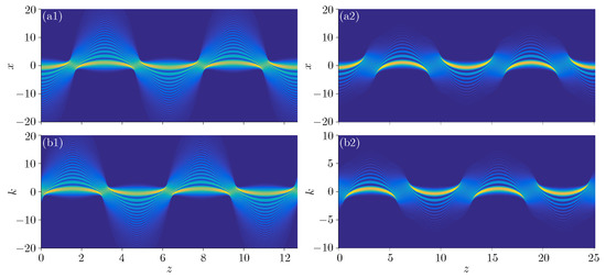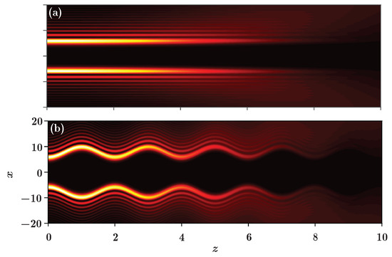 When we set , the trajectory of the beam is , that is, a straight line, so the autofocusing does not occur during propagation, and the propagation can be described by Equation (45). For this case, the linear potential exerts a “pulling” influence that can balance the virtual force which makes the beam focus. While, if the potential is a periodic function , as in the former case, the potential also exerts a pulling effect, and the trajectory is a cosine-like curve, which is also periodic. The corresponding results are displayed in Figure 8.