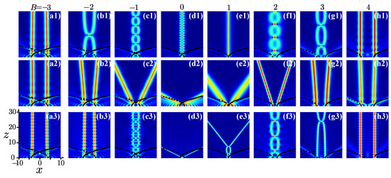 Soliton formation in the interaction of two in-phase (a1–h1) and out-of-phase (a2–h2) incident Airy beams with , in the Kerr medium. (a3–h3) The same as (a1–h1), but with . The distance between beams is chosen by varying B (on the top of the figure). Black solid and dashed curves represent the ideal accelerating trajectories of the main lobes. Reproduced with permission from [35], Copyright the Optical Society of America, 2014.