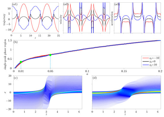 To explore the phase transition region more clearly, we show the numerical simulations of trajectories, velocities, and accelerations of the beam during propagation in Figure 4, for different cases. One can observe that the accelerating trajectories are modulated by the transverse displacement; the beam acceleration with being opposite to the case with . In addition, the beam inversion produces a discontinuity in the velocity and a singularity in the acceleration, which demonstrates nicely that the motion is not harmonic and that there exist two phase regions: the Airy phase and the single-peak phase. According to Equations (24) and (26), the single-peak structure only occurs at the phase transition points; before and after these points, the beam still exhibits multi-peak structure, having to reconnect the accelerating motion before the point with the decelerating motion after the point. The length of the single-peak phase is determined by the size of the decay parameter, as displayed in Figure 4b; the smaller a, the smaller the length, and the harder it is for the beam to make a sudden inversion, so the region in Figure 4c is narrower than that in Figure 4d. However, has no effect on the width of the single-peak phase region when a is fixed.