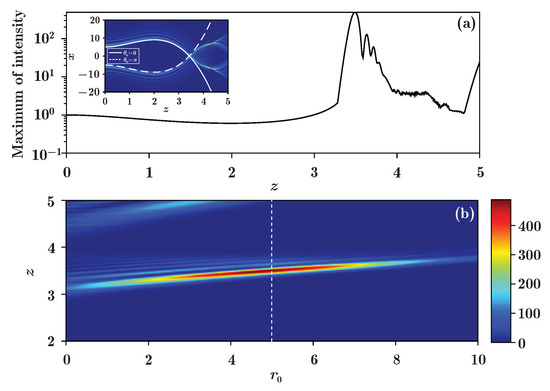 For the case with , from the corresponding trajectory , we know that the beam will undergo autofocusing during propagation, so the process should be described by Equation (43). From the inset in Figure 9, the two components (, ) separate before the focusing point, and then converge. Since the slope of the components at the colliding point is much bigger than without a potential, as in [40], this can be viewed as the components acquiring a larger speed because of the “pushing” effect, hence the autofocusing is strengthened. Similar to the former study, the maximum of the beam intensity (MBI) is also a function of both and the propagation distance, as displayed in Figure 9b; the MBI first increases and then decreases with the increasing of . Besides this effect, one can also see that the location of the MBI also changes with , the reason being that the autofocusing effect requires a longer distance to establish itself when increases. As stated above, the transverse and longitudinal coordinates are normalized to some characteristic transverse width and the corresponding Rayleigh range . The unit of intensity of the beam is arbitrary.