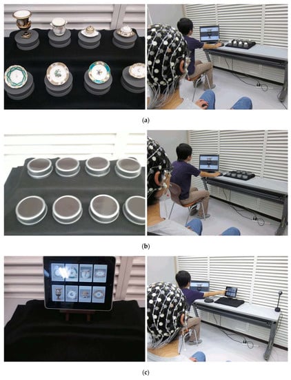Each subject put on an EEG electrode cap and sat 2 m behind the actor (Figure 2). During the first 70 s, the subject stayed at rest looking at a fixation point displayed on the screen. Then, the actor started to operate the UI. The operation time for each picture was about 8.7 s, and a total of eight operation tasks were conducted which included all the eight different pictures in a random order. This set of tasks (about 70 s) was repeated once again. EEG was recorded while the subject was at rest and watching the actor’s manipulation, and data from the resting state and the second set were used for the subsequent analysis. We carried out the above process for each of the three conditions, wherein the order of these conditions was counter-balanced between the subjects. Each subject was instructed to sit still throughout the EEG measurement watching the hand of the actor during the manipulation and the screen during each picture displayed on the screen.