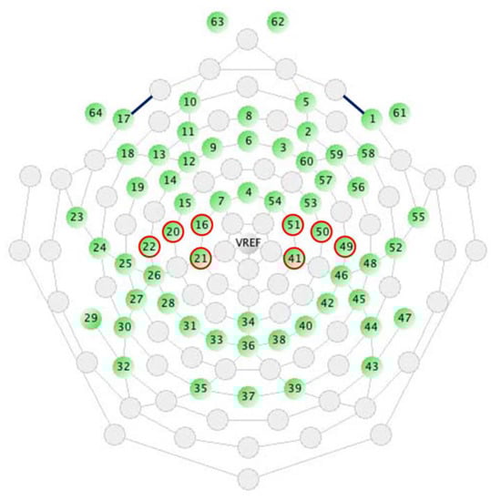 Two regions of interest (ROIs) were defined and respective electrode sites were pooled: left central (16, 20, 21, 22) and right central (41, 49, 50, 51).
