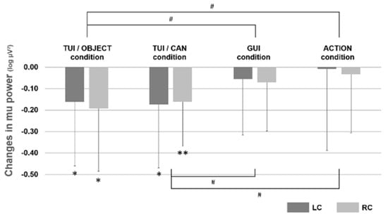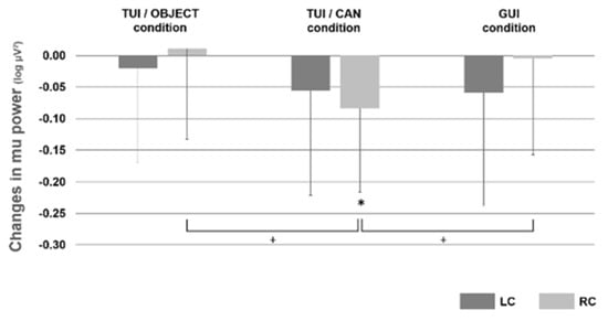 Mu rhythm suppression in each brain area due to UI was examined by comparing the power values in the mu band in the resting state and during the operation, by one sample t-test (Figure 4). As a result, RC in the TUI/CAN condition showed a significant difference (t (14) = −2.46; p = 0.028). In contrast, no brain area showed a significant difference in the TUI/OBJECT condition or the GUI condition. Based on the data from the resting state and the data from the operation, mu rhythm suppression was determined for LC and RC in different conditions (TUI/OBJECT condition, TUI/CAN condition, and GUI condition; Figure 4).