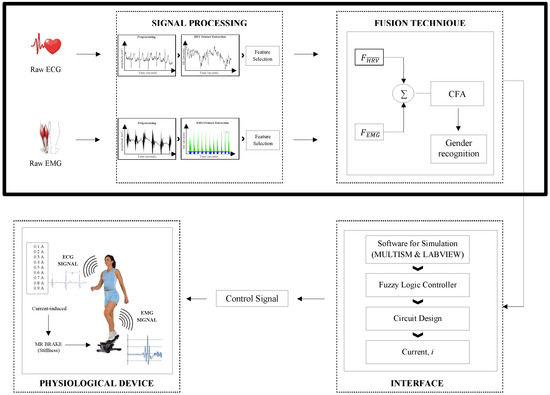 The overview of this research is shown in Figure 2. Firstly, all the raw data are preprocessed for artifact corrections. Next, all the features are extracted and the most relevant features are selected based on the performance and the diversity between the two feature sets. Then, the Combinatorial Fusion Algorithm (CFA) (Hsu et al. [50,51,52]) is implemented to fuse the EMG and HRV features for automatic gender recognition during stepping which may help to isolate male and female subjects before undergoing the rehabilitation process. Finally, the gender classification based on the feature fusion correct rate (%) is obtained. However, the section outside the bold solid line (i.e., the interface section, control signal section and physiological device section) is out of the scope of this study.
