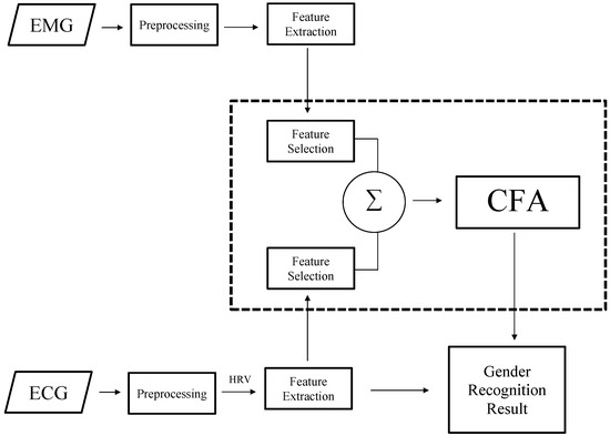 The proposed young gender recognition based on the EMG and HRV biometrics is illustrated in Figure 3. The proposed method is composed of a sequence of processing steps which are the preprocessing of the EMG and ECG signals, feature extraction, feature selection based on the performance and the diversity between EMG and HRV feature sets, and EMG and HRV feature fusion process based on the Combinatorial Fusion Approach (CFA) (Hsu, Chung and Kristal [51] and Hsu, Kristal and Schweikert [52]). In this paper, the feature selection and the feature fusion have been focused as shown in the bold dotted line.