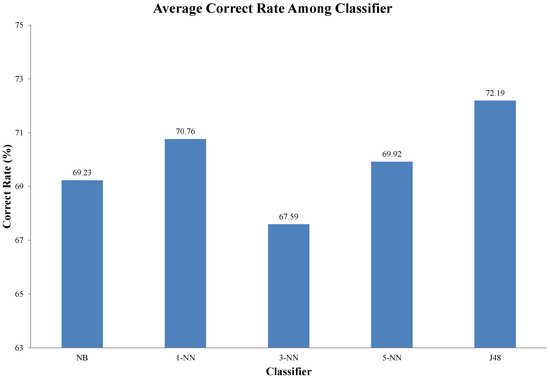 In our experiment, there are 32 features in total and 59 possible values for each feature. The correct rate is calculated to measure the performance and to make comparisons between the machine learning classifiers (see Figure 6). The classifiers used in this work are Naïve Bayes (NB), k-Nearest Neighbors (k-NN with k = 1, 3, 5), and Decision Tree (J48). As shown in Figure 6, the highest average correct rate is J48 classifier with 72.19% of accuracy.