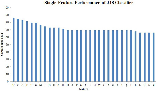 After that, the final performance of each feature from the J48 classifier is sorted in decreasing order as illustrated in Figure 7. It can be seen that the highest correct rate with a rate of 86.44% is generated from feature O (LF_power (ms)) and feature d (maximum amplitude of EMG (ms)) generates the lowest correct rate of with a rate of 66.1%. From previous work in [70], there are significant gender differences (p < 0.05) in the LF in male subjects compared to females. This implies that the male subjects are more active and dominant than the female subjects. Therefore, this is particularly suitable to be used to isolate male and female subjects in developing the rehabilitation devices, control system, and rehabilitation engineering.