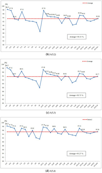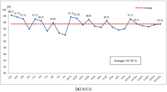 With reference to Figure 10 and Figure 11, the dotted lines show the average of 26 combined features. In this paper, the combined features that have the correct rate over an average of 26 combined features will be the better selected combined features for the automatic gender identification. In Figure 10a, the average correct rate is 95.49%, and it possesses the top-13 combined features which are OV, OA, OVA, OVF, OF, VA, OVAF, OAF, VF, VAF, AF, OVAa, and OVAFa. Next, in Figure 10b, the average correct rate is 93.53% and it possesses the top-13 combined features which are OV, OA, OVA, VA, OVAb, OVAc, OVb, OVc, OAb, OAc, VAb, VAc, and OVAbc. Then, in Figure 10c, the average correct rate is 93.73% and it possesses the top-13 combined features which are OV, OVF, OF, VF, OVFa, OVa, OVFb, OVb, OFa, OFb, VFa, Oa, and OVFab. Lastly, in Figure 10d, the average correct rate is 95.27% and it possesses the top-13 combined features which are OV, OA, OVA, OVF, OF, VA, OVAF, OAF, VF, VAF, AF, OVAFb, and OVAb. Thus, in short, all four 5-feature sets (A) have their own top-13 combined features that contribute to automatic gender identification during the stepping activity using the stepper.