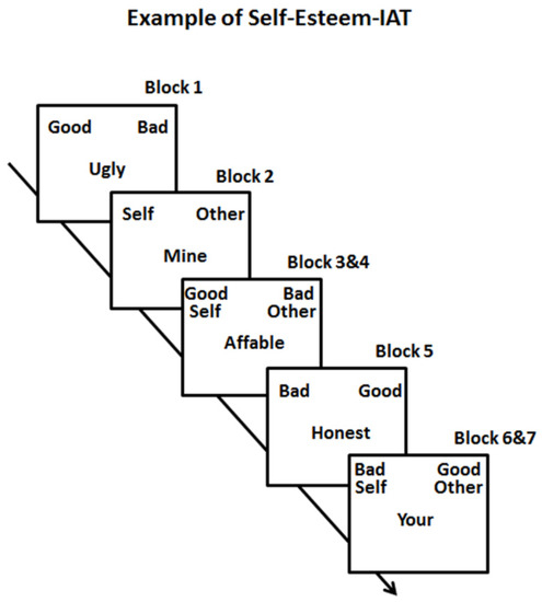 The schematic structure of a self-esteem IAT is reported. The IAT typically consists of seven blocks of trials (each block typically includes from 20 to 60 trials; blocks 1, 2, and 5 are familiarization blocks ,while blocks 3 and 4 and blocks 6 and 7 are the congruent and incongruent blocks, respectively) in which a series of stimulus words appear at the center of the computer screen one at a time and must be associated to the stimulus categories (good, bad, self, other) shown on the upper left or right corner of the screen by pressing two corresponding response keys (e.g., in the first block good and bad words are presented one at a time, e.g., the bad stimulus word ‘ugly’ in the example, and have to be classified as being either good (left key) or bad (right key); the right key response is the correct response in the example). The IAT measures the strength of automatic concept-attribute associations. In the example of a self-esteem IAT this occurs between two groups of target words concerning the concepts of self vs. other and words related to good vs. bad dimensions (i.e., positive vs. negative valence words, respectively). The association is tested in both congruent (self + good; other + bad) and incongruent (self + bad; other + good) conditions. A self-esteem IAT effect is reflected by better performance (shorter response times and/or higher rate of correct response) in congruent than incongruent conditions, and indicates that a person automatically (implicitly) associates the self with positive rather than with negative valence (see [27,28] for further details on the IAT and on the list of stimulus words that can be used for a self-esteem IAT).