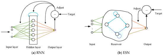 Recently, a new scheme known as reservoir computing (RC), which greatly helped the practical application of RNNs and exceeded traditional fully trained RNNs in many fields [], has been proposed to solve these problems. The echo state network (ESN, Figure 1b) [] is the most popular example of RC. When an input sequence is fed into the reservoir, a complex non-linear state compute is aroused and then processed by a simple readout procedure to produce the output. By generating and training RNNs without changing the transient dynamics of the recurrent network, only updating weights of connections from the reservoir to the output, RC avoids the conundrums of gradient-based algorithms such as slow and difficult progress. These advantages allow ESN to be applied in numerous domains, including pattern classification [,], time-series prediction [,,], intrusion detection [], etc.