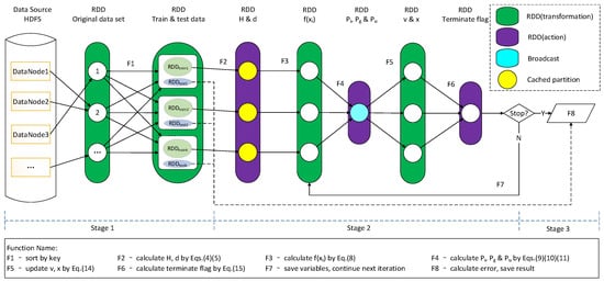 Map-Reduce has many drawbacks, especially in disk I/O processing and re-loading of data at each Map-Reduce processing function. Thus, it is very difficult to develop an appropriate iterative-computational algorithm for reliable and efficient predictive modeling within the Map-Reduce system. Distinct from the Map-Reduce model on the Hadoop platform, Spark is an in-memory computing solution to reduce disk I/O and also an efficient and stable solver of large-scale datasets with both iterative least squares and maximum likelihood optimizations. The intermediate results generated in the training process of Spark are stored in the memory system on the Spark framework as RDD (resilient distributed datasets) objects, which is the most important highlight in Spark. In the RDD programming paradigm, each RDD object supports two types of operations, transformation and action, concretely. Within the whole computation progress, transformations just modify RDDs, and only actions trigger task submission and then calculate the result. Transformation operations include several operations, such as map(), flatMap(), filter(), mapPartitions(), union(), and join(). Then, a new RDD object is produced from each transformation operation. Action operations include operations such as reduce(), collect(), count(), saveAsHadoopFile(), and countBykey(), which compute a result and call back to the driver program or save it to an external storage system [].