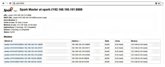 Readers are referred to [] for the details of constructing the Spark cluster. In this experiment, the monitoring interface of the Spark platform is shown in Figure 5. The platform has six workers altogether.