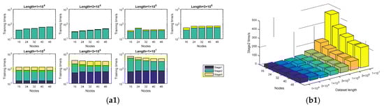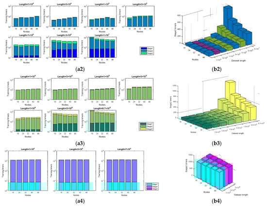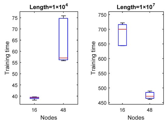 - Observed by the number of nodes, when the dataset is big (1 × 107), the training time decreases when the nodes become larger, and the training time is more stable; however, a relatively small dataset (1 × 104) shows the opposite trend. Figure 7 shows some details about this issue.