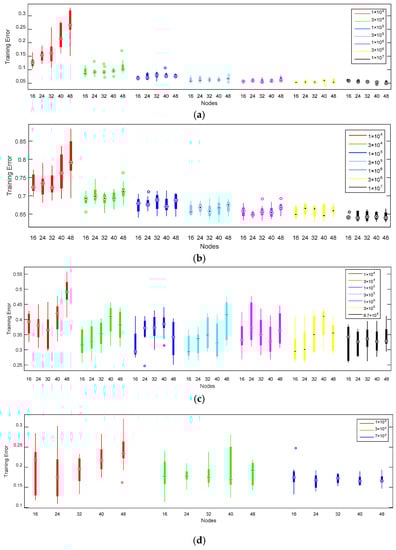 When the dataset is small, the training error increases with the number of nodes. For large datasets, the training error is relatively stable. That is because different sample sizes may affect the training error. This is obviously the case with the length of 1 × 104.