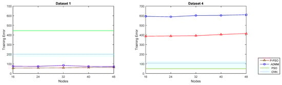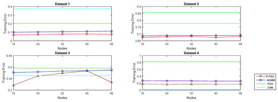 The most significant difference between dataset 1 and 4 is the calculation amount (for ADMM and CNN), and the search range (for PSO and P-PSO). When the dimension of the input data is small (e.g., dataset 1), P-PSO and ADMM can quickly converge, and the traditional PSO needs considerably more iterations. However, once a huge dimension of inputs is fed, the calculation amount/search range would increase sharply, and both P-PSO and ADMM need more iterations. Due to the special network architecture, CNN could converge along with a relatively small iteration number and obtain a rather good achievement. Even though the traditional PSO uses the least iteration numbers, the testing error is quite high (82.2%, Figure 10). The reason is that traditional PSO is not able to handle the search task within such a high-dimensional space, and falls into suboptimal solutions easily.