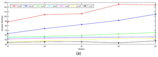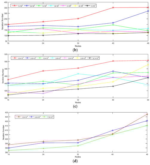 Number of iterations of each dataset in different lengths and nodes. (a) Number of iterations of dataset 1; (b) Number of iterations of dataset 2; (c) Number of iterations of dataset 3; (d) Number of iterations of dataset 4.