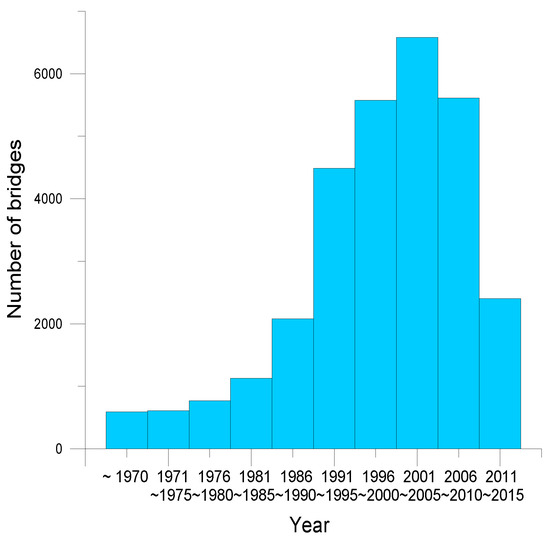 There are approximately 29,896 bridges currently in service in Korea as of 2014. Figure 1 shows the number of bridges according to the year of construction completion. According to the data, the number of newly-built bridges rapidly increased in the 1990s, and the highest number of new bridges was built in the 2000s. However, the number of newly-built bridges has been decreasing rapidly since 2010. Bridges were built in the 1990s to satisfy the demand for infrastructure from active social development, but the number of newly-built bridges has been decreasing since the 2000s because of the expansion of previously planned infrastructure [2].