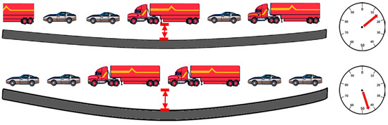 The risk associated with consecutive heavy vehicles increases when the headway is narrow during traffic congestion with an extremely low travel speed, which increases the number of vehicles on the highway bridge. Moreover, for consecutive vehicles, there is a high frequency of certain vehicle types (particularly heavy vehicles) depending on the driving or passing ability of the vehicle. The safety of highway bridges is most affected by heavy vehicles traveling consecutively at a low speed, as shown in Figure 3.
