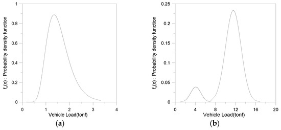 A field survey was performed to develop the probabilistic load models for each type of vehicle, as given in Table 5 and Figure 4. The field survey was performed simultaneously on national highways (Regions I–VII) in Korea, which have vehicle load weighing machines. The indices and are the average and standard deviation, respectively, for a normal distribution. The indices and represent the average and standard deviation, respectively, for a log-normal distribution. The first mode indicates the empty or lightly-loaded condition, and the second mode represents the heavily-loaded condition. The minimum values in Table 5 indicate the minimum weights of the vehicle model, while the maximum values indicate the summation of maximum loads on each vehicle axle. Correction coefficients were used to calibrate the distribution curve by considering the maximum and minimum values as a ratio of each mode. For the purpose of simplification, multiple tandems in each vehicle model were modeled as a single tandem (i.e., P, B, T, and TT were modeled as two-axle vehicles, and ST has three axles).
