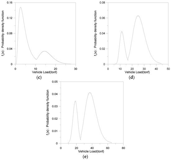Probabilistic characteristics of the proposed vehicle weight models: (a) P type; (b) B type; (c) T type; (d) TT type; and (e) ST type.
