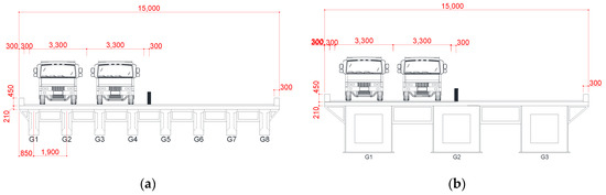 Target bridge section properties at the mid-span (mm): (a) PSC I-type girder; and (b) steel box girder.