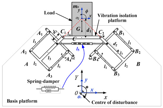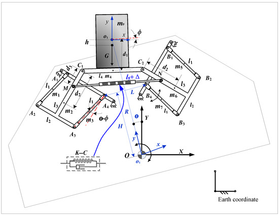 The absolute coordinate system of the basic platform (i.e., where it rocks) is . is the dynamic coordinate system established at the rotating center of the load mass. When the basic platform is fixed, the rocking system holds one rotational degree of freedom around , and the internal rods of the system move as angular changes. The rocking rods, , are the rods in the parallelogram, the mass center of which hinges on the respective shape. To simplify the calculation, and have an integrated body that holds one associated center of mass. The length of the vibration isolation platform is . is the distance from to the vibration isolation platform, and is the initial length of the spring. At the initial position, no tension or pressure is exerted on the spring. is the distance from the ends of the spring-damper rods to points ( and ) on the ipsilateral vibration isolation platform. According to the geometric relationship, the relationship of rod lengths with position can be determined as: