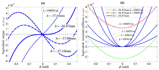 Figure 3a demonstrates the strong non-linearity of the relationship between the equivalent torque and torsional angle at different gravity centers (). Note that h = −36.87 is a critical position where the equivalent torsion is approximately zero. In Figure 3b, the positions of the gravity and rotation centers of the load are clearly important. When h > −36.87, the equivalent torsional stiffness is negative, whereas when h < −36.87, the equivalent torsional stiffness is positive. Furthermore, when h = −36.87, the mechanism is at equilibrium, and the equivalent torsional stiffness is zero. The preceding results suggest that the load’s gravity center position strongly influences the equivalent torsional stiffness. Each equivalent non-linear torsional stiffness is associated with an independent linear spring stiffness, such that when the load is at equilibrium position (), is near zero. When QZS is implemented, stiffness increases the non-linearity associated with load movement. The spring stiffness , does not affect the load’s equilibrium position, but rather influences the non-linearity of the QZS isolator. Moreover, the transmissibility of non-linear stiffness is a key factor in vibration isolation.