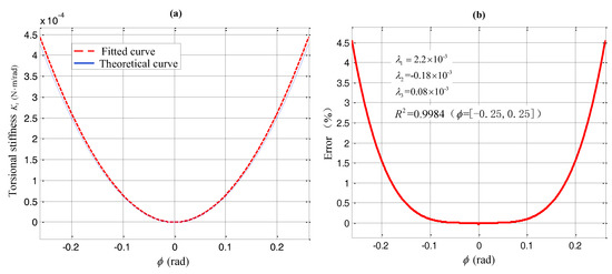 The equivalent torsional stiffness can be obtained from the first-order derivative of the equivalent torsion. The theoretical and fitted curves of the equivalent torsional stiffness and the error distribution curve at are given in Figure 4.