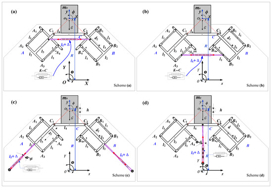 Four linear spring configuration schemes. (a) Spring-damping connects two main branches; (b) Spring-damping connects two parallelograms; (c) Spring-damping connects parallelogram and base platform; (d) Spring-damping connects vibration isolation platform and base platform.