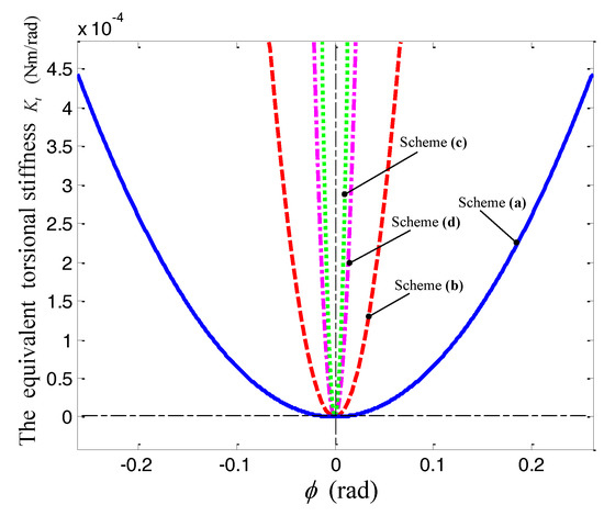 The characteristic of QZS isolators suggests that the linear spring stiffness is zero at the equilibrium position. To meet the demand for vibration isolation at lower frequencies, a lower equivalent torsional stiffness distribution is needed. Accordingly, four configuration schemes, (a), (b), (c), and (d), are shown in Figure 5 (a–d, respectively). Here, the same stiffness coefficient and initial length () were adopted, and in Figure 5c, two springs with symmetric distribution are used. Equivalent torsional stiffness can be obtained using the method described in Section 3.1.