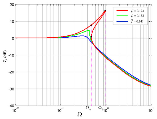 The characteristics of the vibration isolator are mainly influenced by parameters such as the stiffness coefficient, damping coefficient, and mass. Here, the basic system parameters were set at , , and . To demonstrate the advantages of this vibration isolation system, we set the amplitude to . Figure 7 depicts the relationship of transmissibility with the damping ratio.
