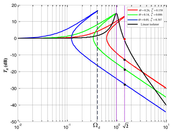 Figure 8 demonstrates that transmissibility is affected by the input harmonic disturbance amplitude, such that a higher input amplitude is associated with a higher down-jump transmissibility frequency. At , the down-jump frequency exceeds the linear natural frequency of the system (Ω = 1), and the isolator performs relatively poorly. However, if the input disturbance amplitude is small (e.g., ), the down-jump frequency is less than the linear natural frequency. In other words, the capacity of this vibration isolator exceeds that of a linear vibration isolator at a low-amplitude vibration. However, if the input disturbance frequency exceeds at an amplitude of , the transmissibility is approximately −11 dB, and the linear isolator would yield a better performance. Regarding the entire range of vibration isolation, the capacity of this isolator is superior at low input disturbance amplitudes.