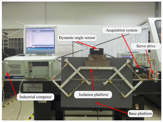 Figure 9 shows an experimental prototype system constructed based on the theoretical model. This system comprised a vibration isolation platform, input disturbance unit, measurement unit, and computer control unit. The base platform was driven by servo motors that linked the crank and rocker, which rotated around point . Accordingly, the displacement, velocity, and acceleration of the servo motor could be calculated based on the demand for input disturbance. The measurement unit comprised a MEMS tilt sensor, an AD acquisition system, and a computer. The tilt sensor was placed above the load and parallel to the vibration isolation platform, allowing simultaneous measurement of the angle from the platform to the horizontal line. The changing trajectory of the angle could then be observed on the computer screen.
