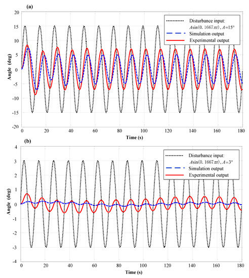 The simulation and experimental input parameters were set as follows. To mimic the influence of sea waves, which reportedly induce rocking motion periods of 3–12 s for ships [35], we set period T at 12 s and 3 s and amplitude A at 15° and 3°. The linear spring damp chain parameters k and c are equal to 200 N/m and 10 Nm/s, respectively. Figure 10 shows the simulation output and the experimental output at a disturbance frequency and different amplitudes.