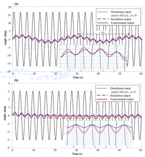 Figure 11 shows the results of a simulation and an experiment conducted at an input disturbance frequency of 0.3333 Hz and input amplitudes of 15° and 3°.