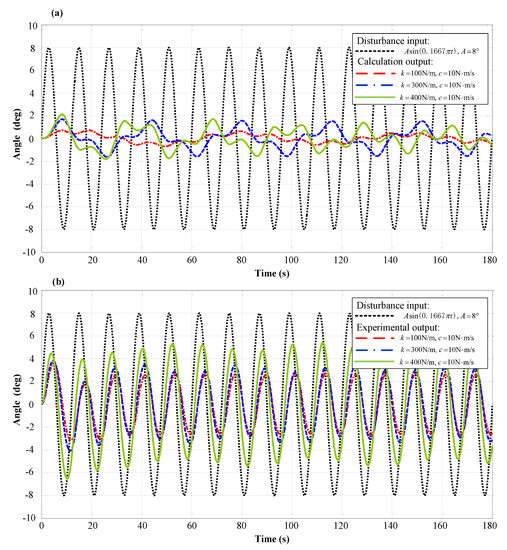 The influence of linear spring damping chain stiffness on isolator performance was also evaluated experimentally, using harmonic disturbances, T = 12 s, and A = 8° as the set inputs. Figure 12 shows the simulation and experimental outputs.
