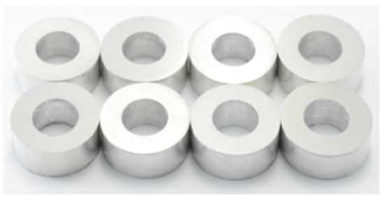 The materials used in experiments were commercially acquired extruded 6061 aluminum alloy tubes (Wan Sow Aluminum, Tainan, Taiwan), and were modified intentionally to have an inner diameter of 8 mm and an outer diameter of 19 mm. Table 1 shows the chemical compositions. The geometry of tubes was deliberately chosen to not meet the experimental specifications described in [5,6] so that the potential peripheral coarse grains made from previous processes can be completely removed. The specimen was made from the raw tubes by making the outer diameter 18 mm, the inner diameter 9 mm and cutting to a thickness of 6 mm (the standard specimen geometry has the ratio of outside diameter, inside diameter, and thickness equal to 6:3:2). Thereafter, the specimen was ground with abrasive papers in number of 400, 800, and 1200, respectively, and polished with polishing pad with a suspension of 1 μm alumina powder. Figure 1 shows the prepared specimens.