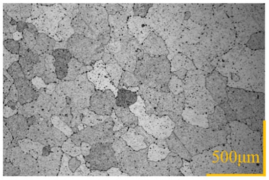 In this study, the grain size is expressed as the average grain diameter by using the linear intercept method, under which several circles with a known radius are drawn on a metallographic image and the number of intercepts between the circles and the grains is then counted. The average grain diameter is then determined by dividing the total length of circles with the total number of intercepts and magnification of image and by multiplying by 1.5 for assuming spherical grains [9]. Figure 4 shows the microstructure of the specimen made from the incoming alloy, which has the average grain size of 237 μm. There were no peripheral coarse grains found in the specimen. Fibrous grains elongated as mentioned in [1,2] were not found in any direction of the specimen either. The material of the specimen was believed to have recrystallized before shipment.