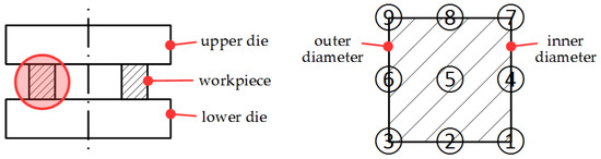 The ring compression test used flat dies, so that it can be treated as a free forging or upsetting process. The polished specimen was placed in a furnace (Risen Instrument, Taipei, Taiwan) and heated to the specified temperature above the recrystallization temperature of the material for more than 50 min to reach thermal equilibrium. The specimen was then taken out and placed between the flat dies for forging process. After compressing the specimen to the desired stroke, it was immediately removed and quenched in water to preserve the grain structure in the metal. After the specimen was completely cooled to the room temperature, the grain size was observed with microscope (Nikon, Tokyo, Japan). Figure 2 shows the schematic experiment procedure.